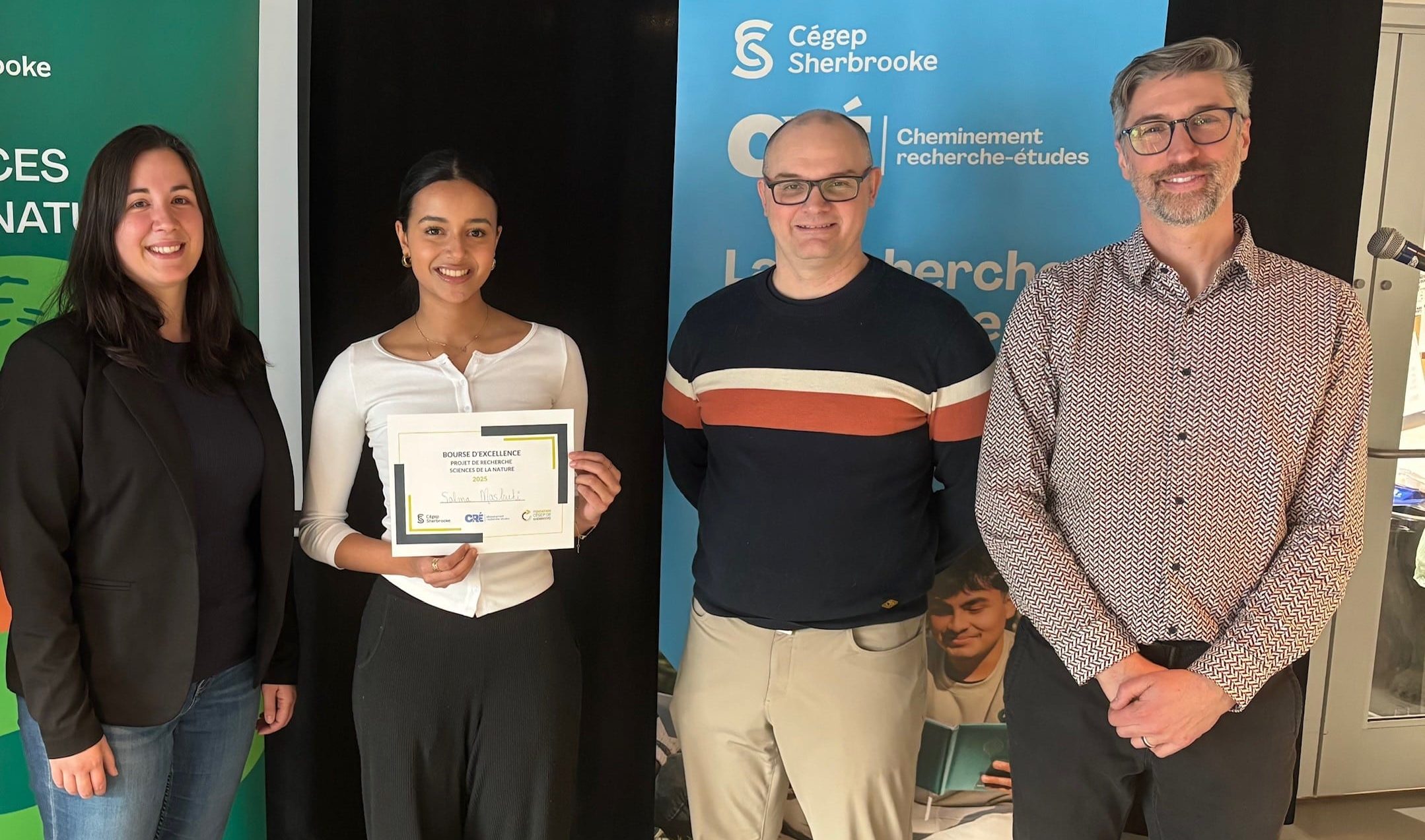 La Fondation Cégep de Sherbrooke est heureuse de souligner l’excellence et l’engagement des personnes étudiantes qui participent au cheminement recherche-études (CRÉ) en décernant annuellement deux bourses de 500 $. Ces bourses CRÉ ont été décernées le 29 janvier dernier, lors de l’événement de présentation des travaux de recherche des personnes étudiantes ayant participé au CRÉ à la session d’automne 2025.