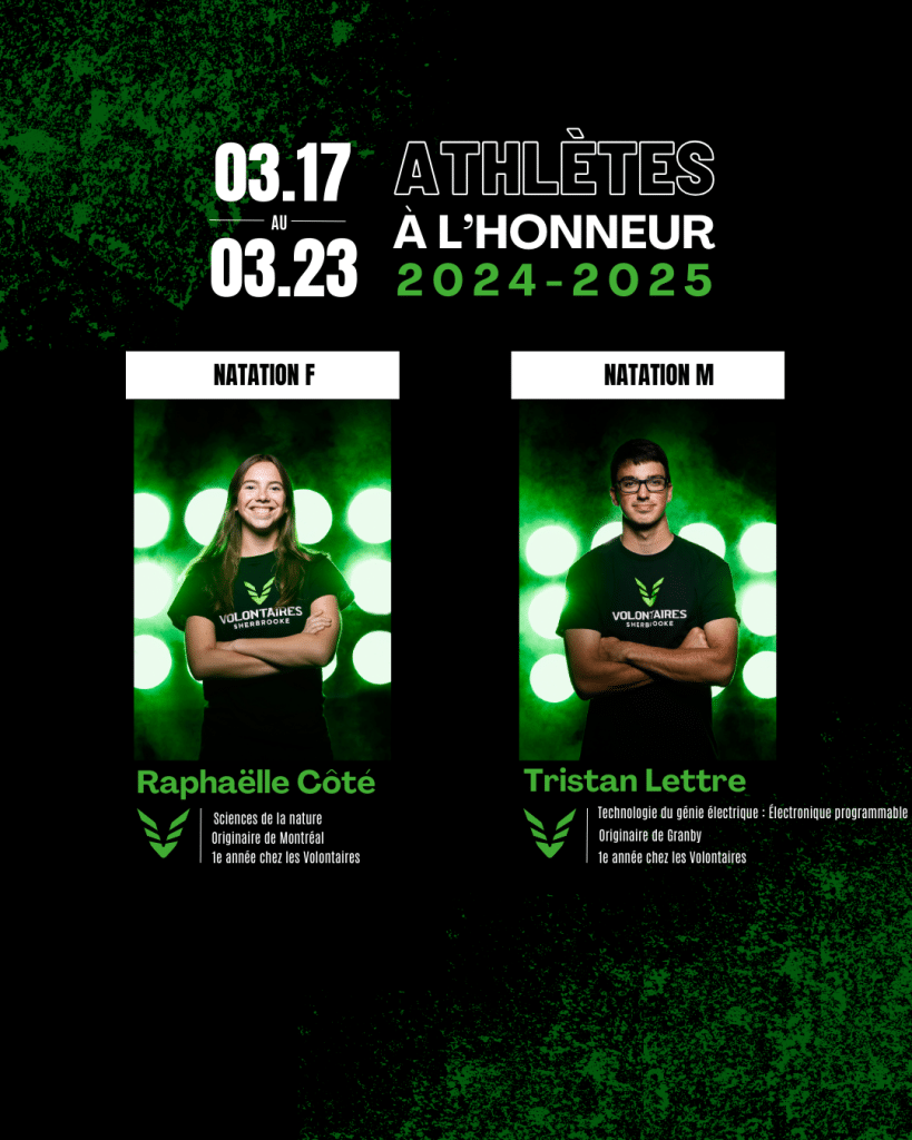 - Raphaëlle Côté (natation), étudiante en sciences de la nature, originaire de Montréal.